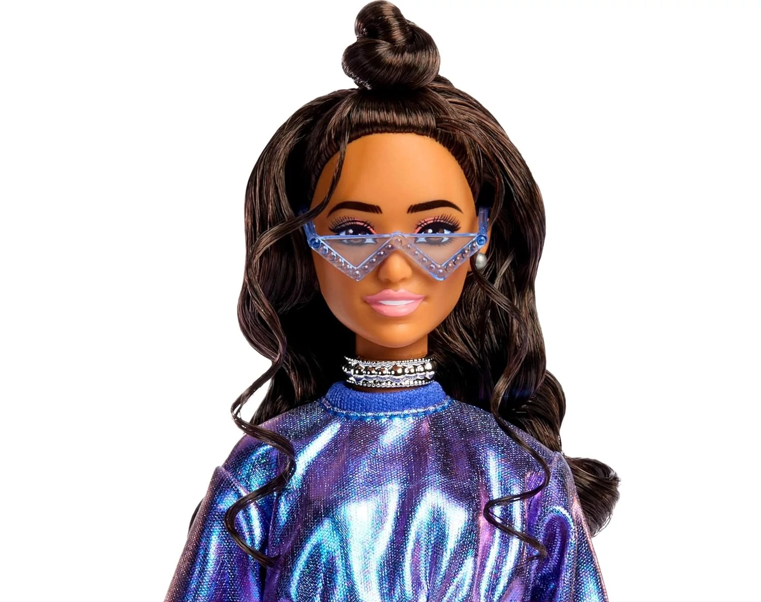 - Barbie baba ultra-fényes ruhájában megmutatja, milyen elbűvölő a metálfényű megjelenés. A jégkék rövid pulóvered tökéletesen illik a fodros szoknyához.