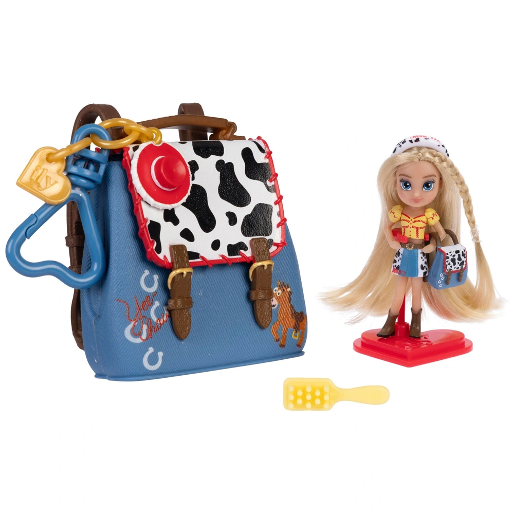 - Egy csinos mini baba, melyet Jessie ihletett, apró kiegészítőkkel és egy szuper aranyos tehénmintás hátizsákkal!